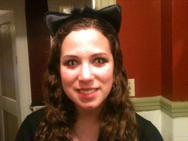 On Saturday night, DanceWorks Boston hosted a huge Halloween party at Au Tua Nua in Boston. My good friend and fellow DWB-er, Devlyn, and I headed to our friend Dana’s to have some wine and get ready for the party. For my cat costume, I wore a black, high collared lace-covered dress, black heels, white lace hand gloves, a jingle heart necklace (in place of a bell), cat ears and of course, my bright yellow contacts. I coated my eyes with liquid eyeliner and smoky black make-up. It was pretty cool. Almost everyone noticed, most people freaked a little. Loved it.
